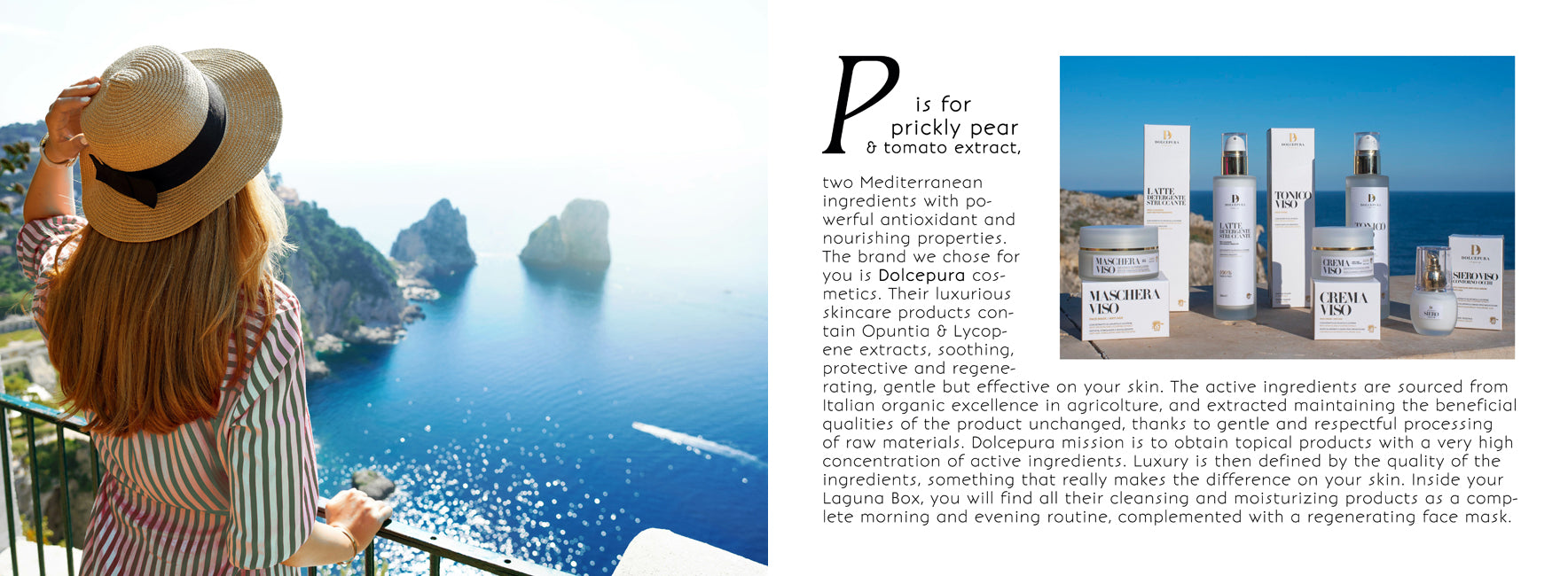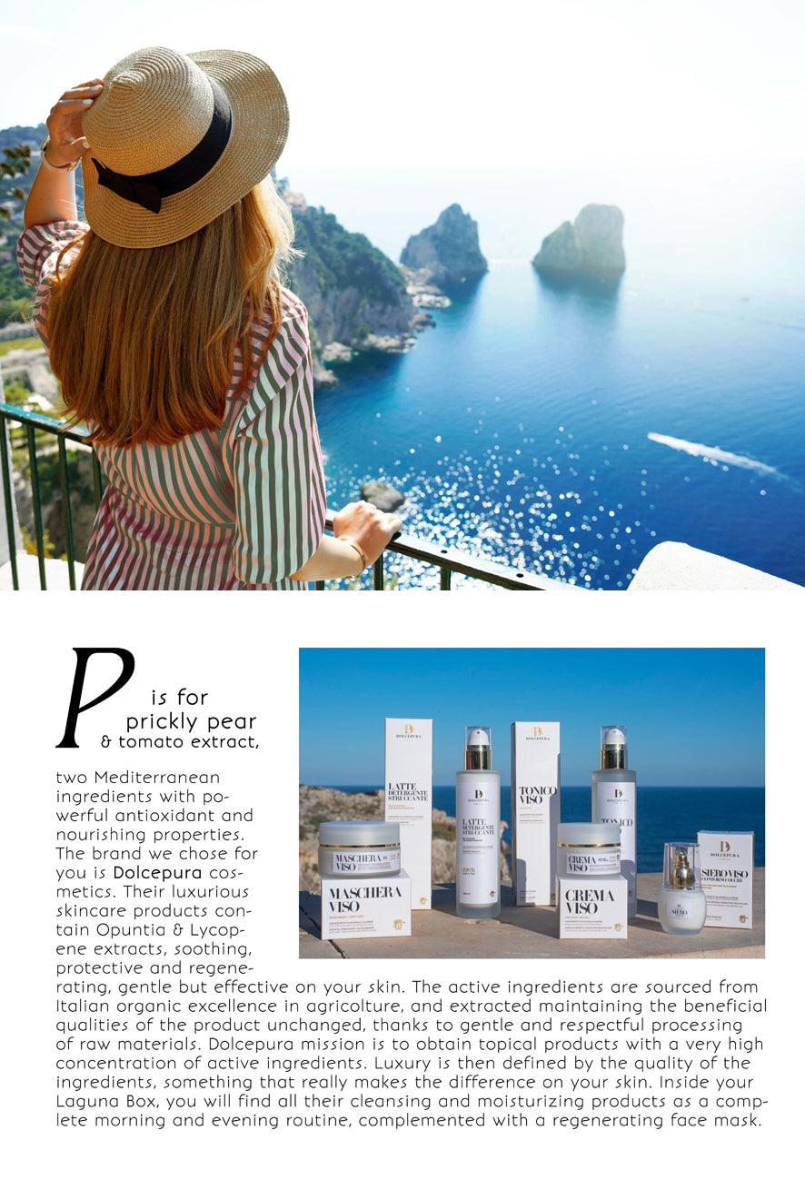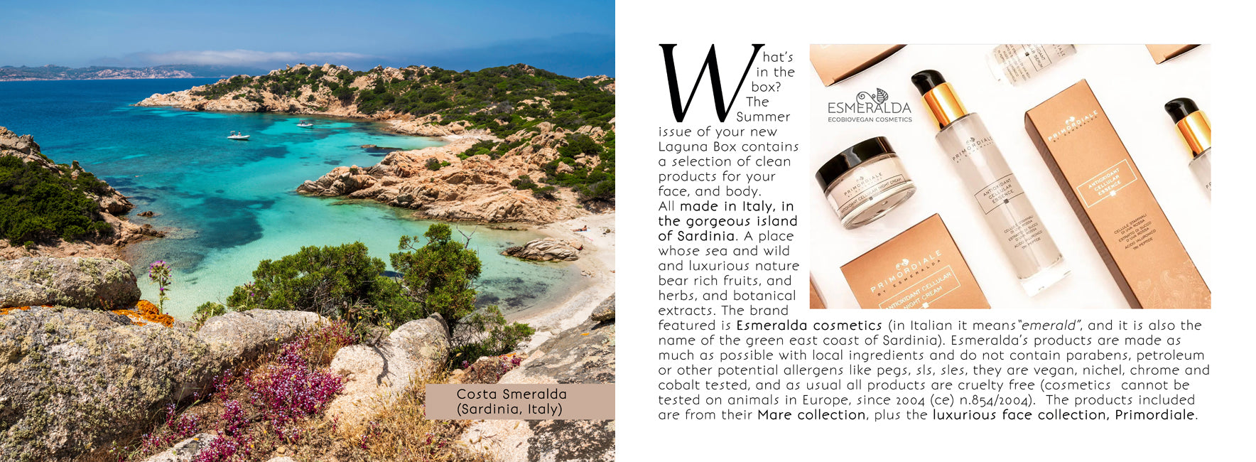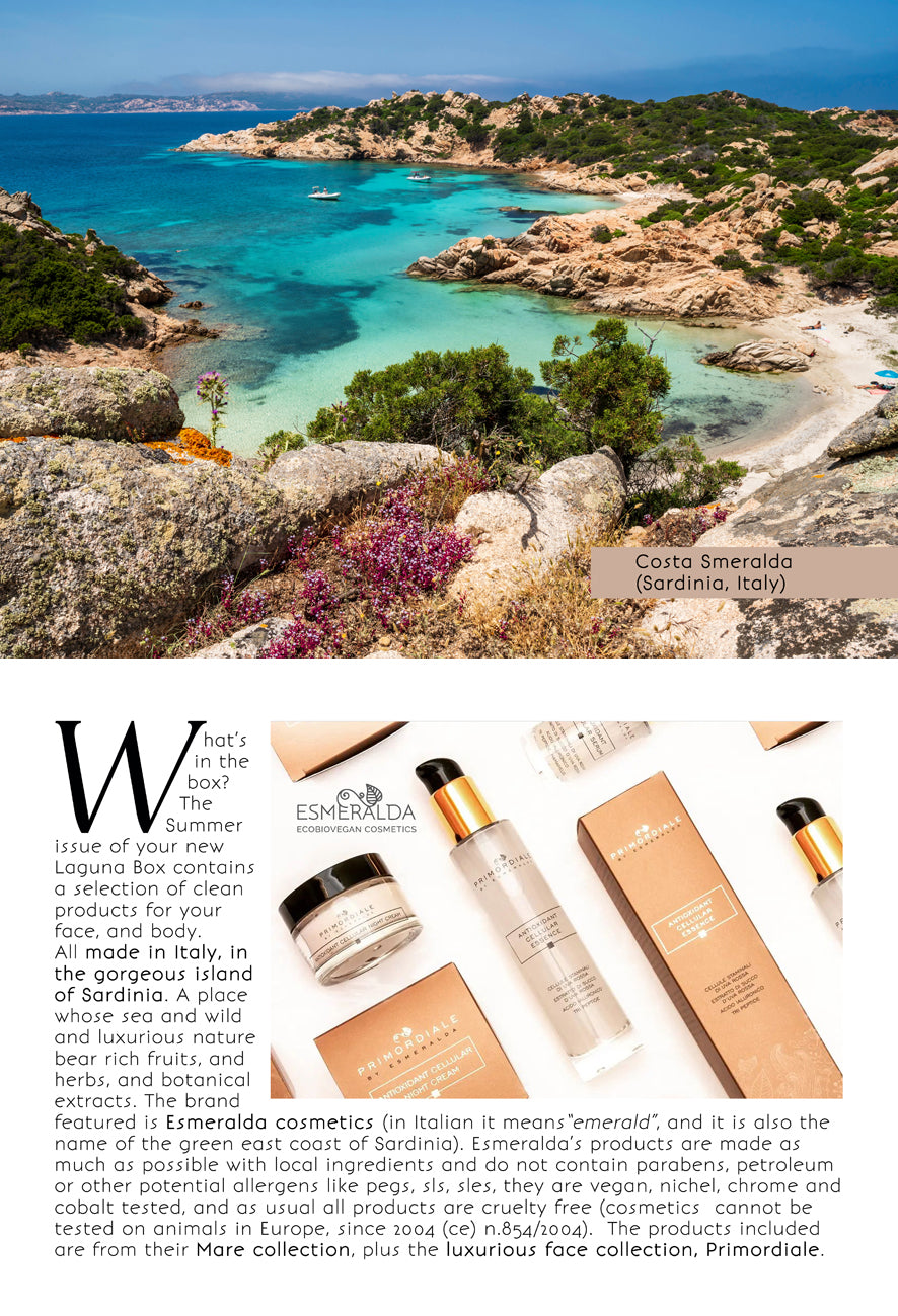 This issue of the Laguna Box contains a selection of clean products for your face, and body. All made in Italy, in the gorgeous island of Sardinia. A place whose sea and wild and luxurious nature bear rich fruits, herbs, and botanical extracts.