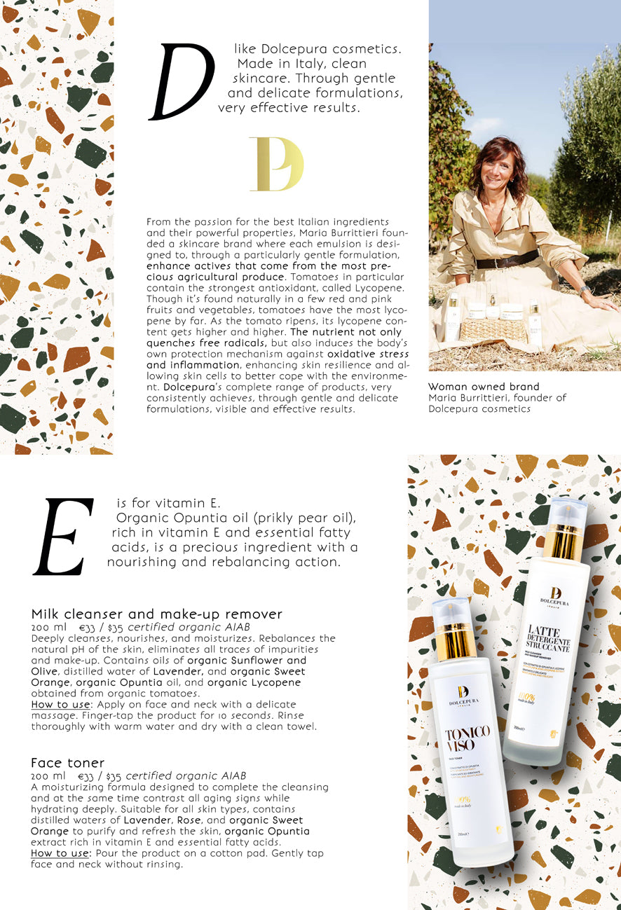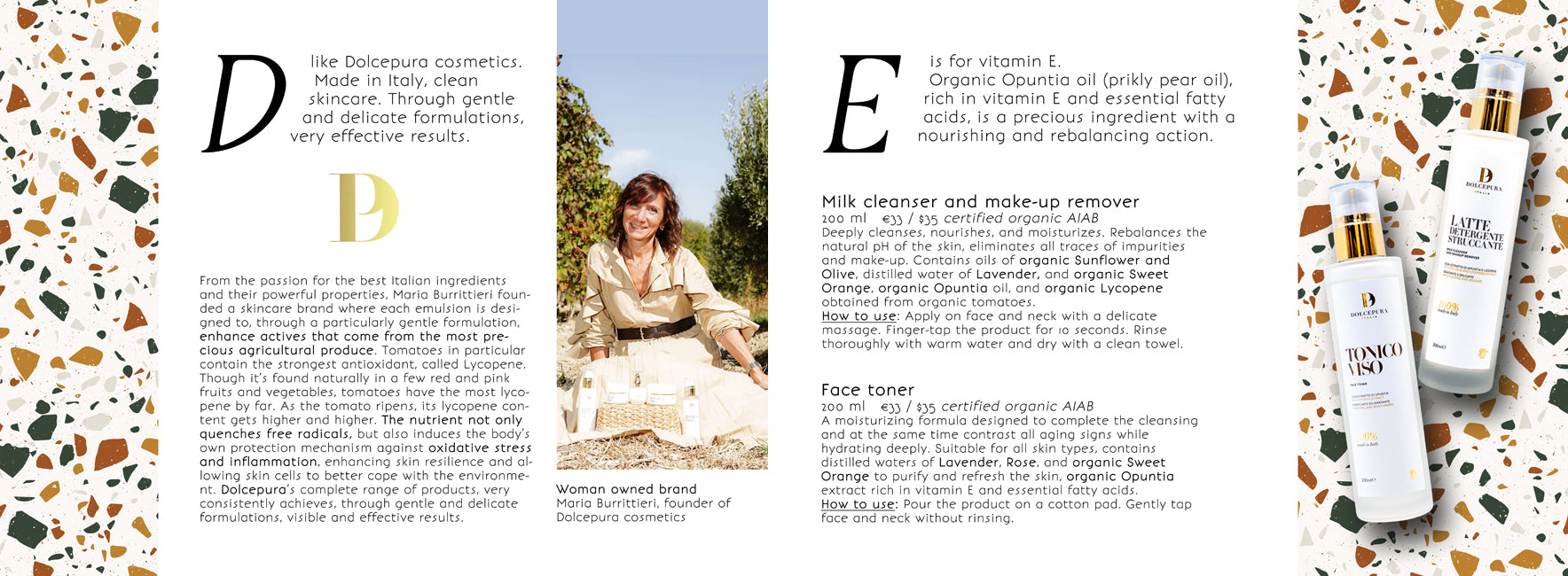 Skincare containing: organic Opuntia oil (prickly pear oil) rich in vitamin E and essential fatty acids, a precious ingredient with a nourishing and rebalancing action, and organic Lycopene, obtained from tomatoes, the most powerful antioxidant in nature.