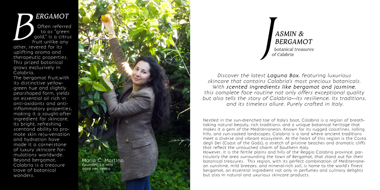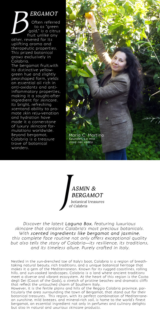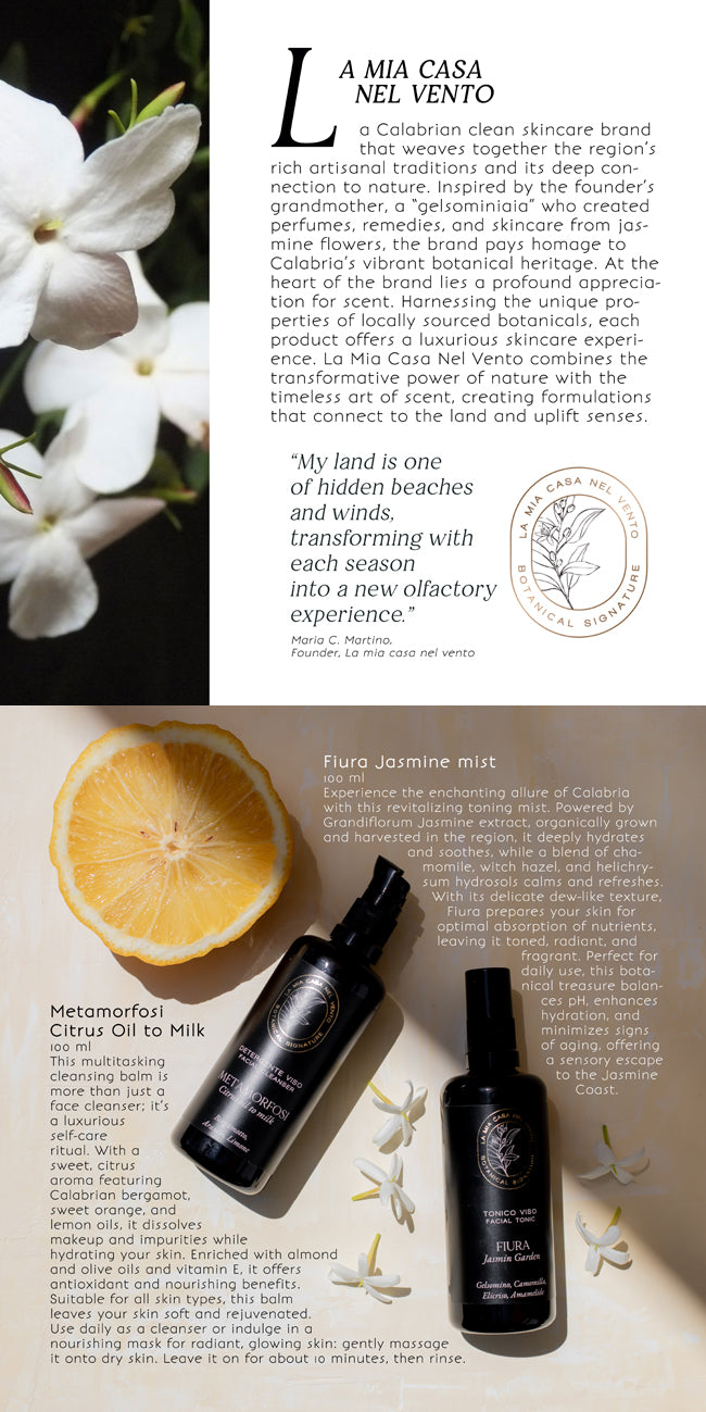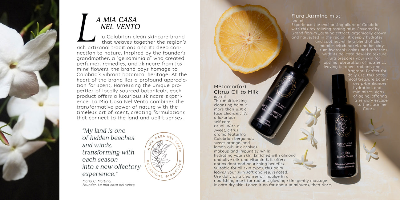 Rooted in the heart of Southern Italy, LaMiaCasaNelVento brand captures the essence of the region through precious local ingredients, most notably the rare and fragrant bergamot fruit and jasmine flower. Each product is an expression of Calabria’s perfumes and botanical extracts, a true reflection of this land surrounded by the Mediterranean Sea.